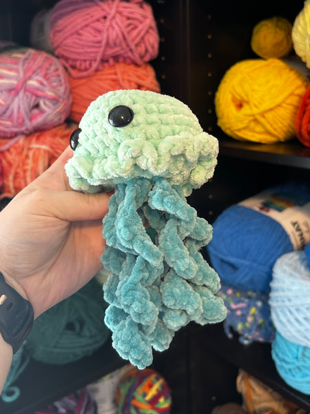 Each plushie is meticulously handcrafted from high-quality, soft blanket yarn, ensuring it is both durable and snuggly. The baby jellyfish design features delicate tentacles and a soft, round body that makes it perfect for hugging and snuggling. The plushie measures approximately 5.5 inches in length, making it the perfect size for little hands to hold and play with.